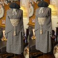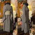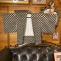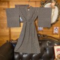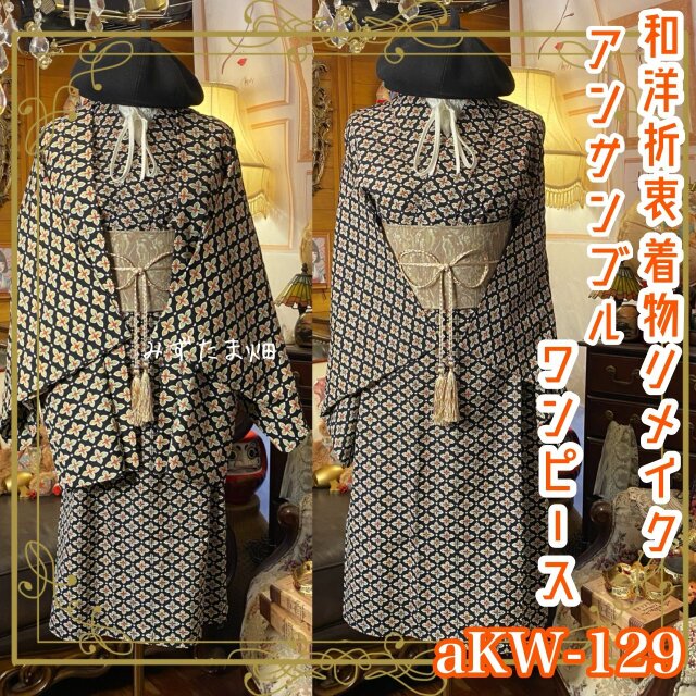 【 和洋折衷ワンピース 着物アンサンブル 名古屋帯サッシュベルト付き ハンドメイド レトロ 古着 黒地 小花タイル柄 aKW-129 】