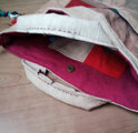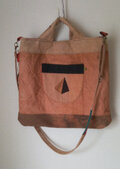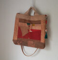 前面にポケットが二つあるのがメインのバックです。帯芯なのでカチッとしています。底の柔道着の部分は柿渋染めの鉄媒染をしました。まだらに染め上がりました。それも面白いと思って使ってみました。柿渋染めの味と思っていただける方でお願いします。内袋は布団袋を使っています。なかなか良い味わいです。