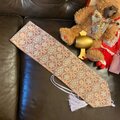 ベースカラーは、深みのあるテラコッタやダスティローズのような、暖かく落ち着いた色合い。そこに淡いベージュやオフホワイトの文様が織り込まれ、全体にアンティークな雰囲気と優雅さをもたらしています。柄は、全面に花々や唐草が緻密に描き込まれた連続したデザインです。異国の染織品を思わせるようなエキゾチックな魅力と、日本の伝統的な七宝つなぎのような吉祥性が融合したデザインです。