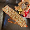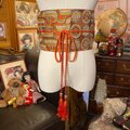 【名古屋帯リメイク サッシュベルト 飾り帯 和洋折衷 ウエストマーク ハンドメイド レトロ 古着 LL〜4L 鮮やかなオレンジと緑にモダンな曲線の幾何学柄 GOB-34】