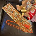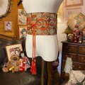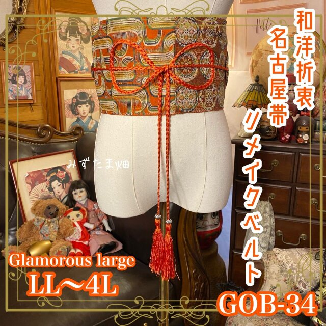名古屋帯リメイク サッシュベルト 飾り帯 和洋折衷 LL〜4L 鮮やかなオレンジと緑にモダンな曲線の幾何学柄 GOB-34