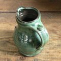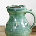 素地にリベットを施し、化粧泥を掛けてから織部釉を掛けてあります。