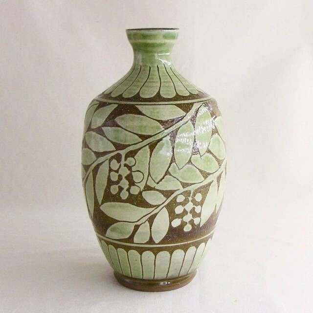 化粧泥は北海道蘭越町で採掘した白粘土を使用し、釉薬には自家製灰をブレンドした淡緑釉を使用。