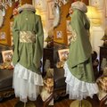 【単衣着物 2way アシンメトリー ガウン 羽織り ドレス ワンピース ハンドメイド 和洋折衷 洗える 化繊 リメイク 名古屋帯サッシュベルト レトロ 古着 モスグリーン×白レース KD-90】