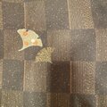 落ち着いた焦げ茶色や墨黒に近い、非常にシックな色。その上に、金茶色、細かい縦縞と大胆な市松が表現されており、光の当たり方で柄が美しく浮かび上がります。まるで古都の夕暮れのような深みと落ち着きをあなたにも。緻密な市松と縦縞が織りなすパターンは、知的でエレガントな大人の女性の品格を際立たせます。