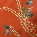 落ち着きのある朱色(オレンジがかった赤)に、流れるような植物文様が描かれた小紋。繊細な色使いの花々が、優しく、かつ華やかな印象を与えてくれます。