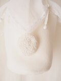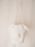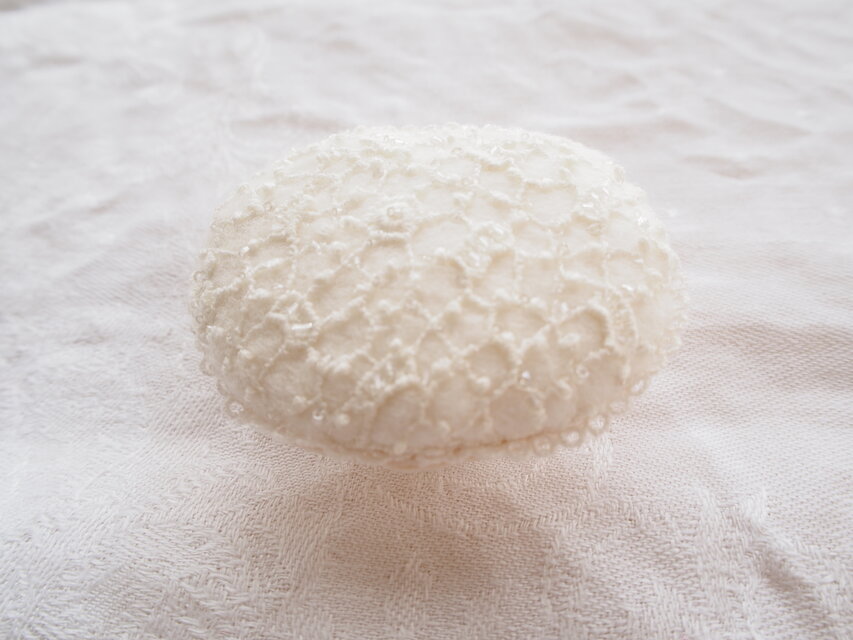 オフホワイトの柔らかなウールの上に、アンティークレースを重ね、中に綿を詰めた、柔らかな質感のブローチです。