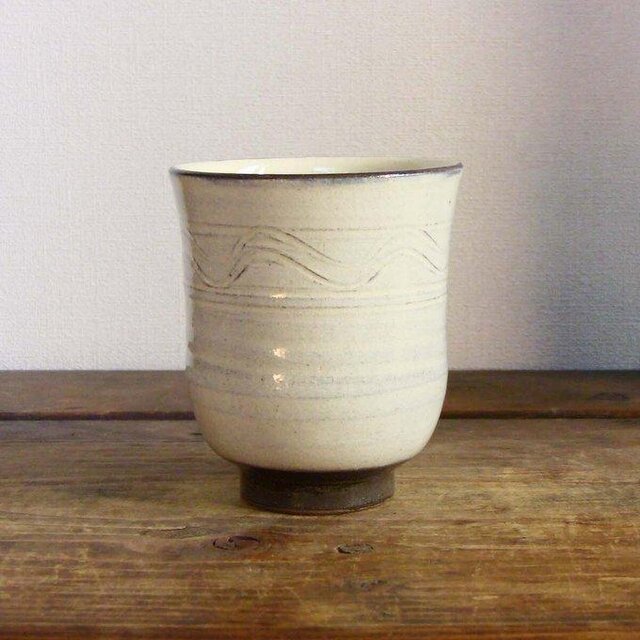素地に櫛目模様を描き化粧泥を掛けてから透明釉を施釉して焼成しています。