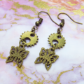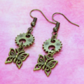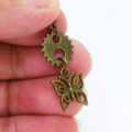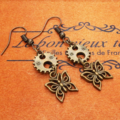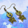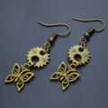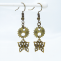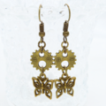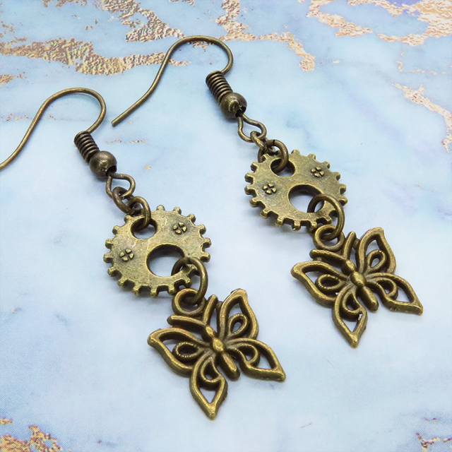 アンティークゴールドの蝶のモチーフと歯車を組合せたスチームパンク風のコンパクトなピアスです