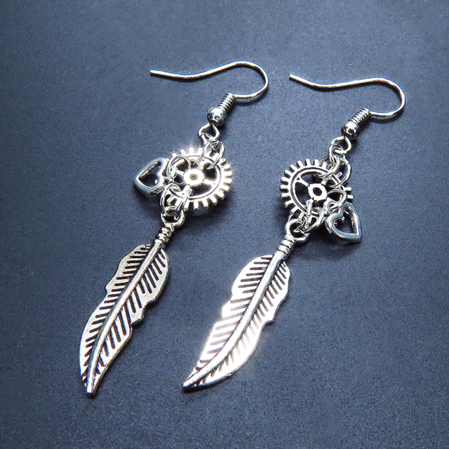 アンティークシルバー フェザーと歯車を組合せたスリムなピアス スチームパンク風 ハート