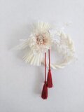 華やかなレッドのタッセル&ゴールド系の水引き飾りも添えて**