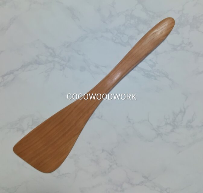 柾目のチェリー材で木べらを作りました。一般的な木べらよりも角を落とし、柄を厚くなめらかに仕上げていますので、使いやすいと思います。とても軽い木べらです。毛羽立ちにくい加工をしていますので、気持ちよく使用出来ると思います。