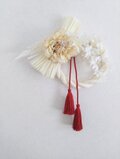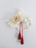 華やかなレッドのタッセル&ゴールド系の水引き飾りも添えて**