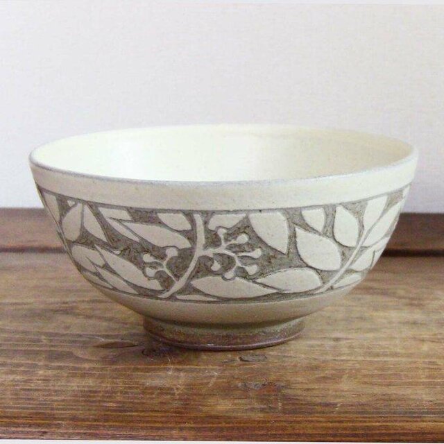 器全体に化粧泥を掛け、ナナカマドを描いてから余分な化粧泥は削り落として図柄を残しています。