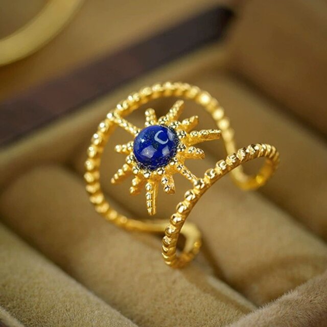 太陽をテーマにしたリングは、日常のファッションに特別な輝きを添えるだけでなく、贈り物としても喜ばれるアイテムです。深い青色のラピスラズリは、無限の宇宙を思わせ、持つ人に神秘的な魅力をもたらします。このリングのデザインは、古代の神話や伝説からインスピレーションを受けており、太陽の象徴としての力と知恵を表現しています。