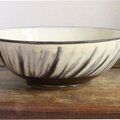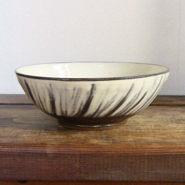 素地に化粧泥を掛け藁を束ねた刷毛で模様を施してから透明釉を掛けて焼成しています。