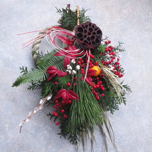 フレッシュ(黒松・ヒノキ・南天・オタフク南天・シダ・ヒムロスギ・金柑・ネコヤナギ)・ドライ(ナンキンハゼの実・実とらずワラ・ハス・稲穂)
