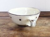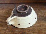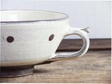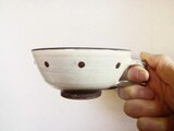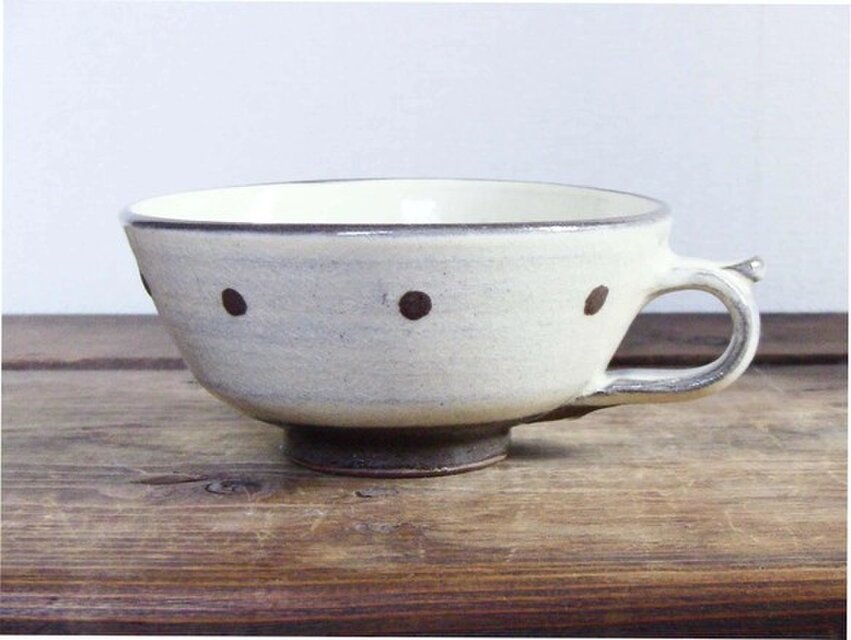 カップ全体に化粧泥を掛け、スポイトで水玉模様を描いてから透明釉を掛けて焼成しています。