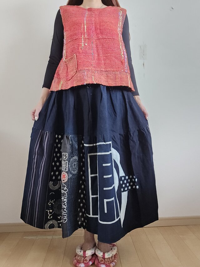 着物リメイク 半纏 藍無地 雪ん子など パッチワーク スカート