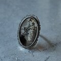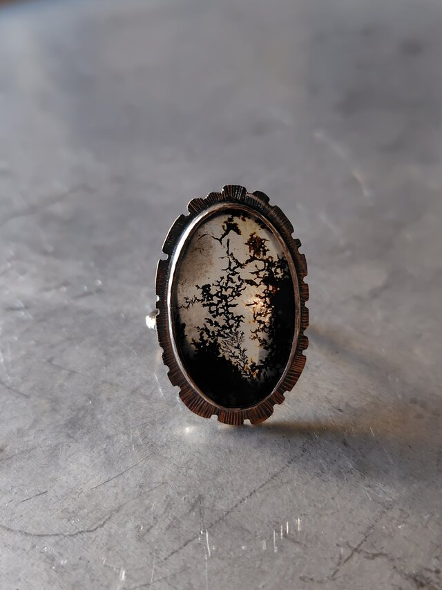 雲に隠れた月を森の中から見上げたようなデンドリティックアゲートを燻し加工を施しアンティークな雰囲気のシルバーリングに仕立てました。