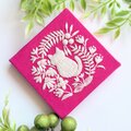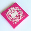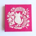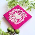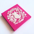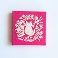 手のひらサイズのミニパネルです。フューシャピンクのコットンリネンにこねこと草花を丁寧に手刺繍しました。