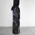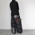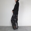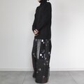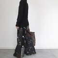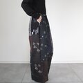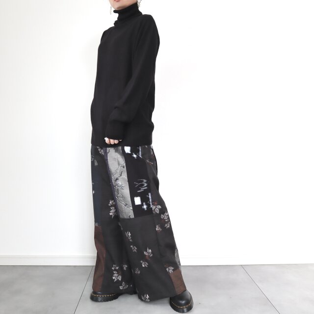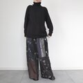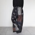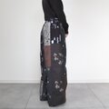 アンティーク紬や久留米絣をパッチワークして作ったワイドパンツです。黒~グレー系の生地でまとめました。ウエストにはゴムを通しており、両サイドにポケットがついています。裏地はありません。