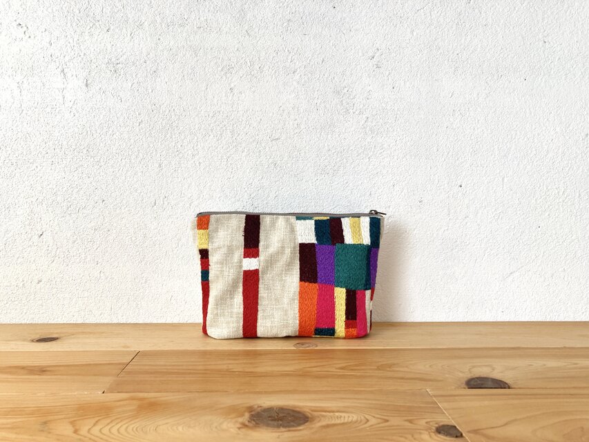 3色の綿糸でのステッチが とっても丁寧に 刺してあり 美しいデザインに! ヌメ革の持ち手が 個性的でインパクトあり 経年変化が 楽しみ。 コンパクトに くったりなるので 使い勝手が良い。