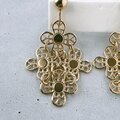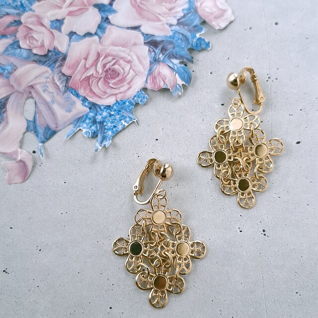 1949年にニューヨークで創業したSarah Coventry(サラコベントリー)の1971年に販売された“Golden Petals”のフラワーの形をしたプレート状のゴールドメタルが繋げられて菱形になったデザインのヴィンテージイヤリングです。