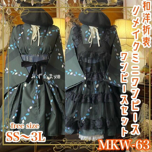 着物 ミニ丈 ワンピース ドレス 和ロリ 2部式作り帯 名古屋帯 リメイク 和洋折衷 洗える 化繊 freeサイズ MKW-63