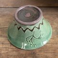 素地に化粧泥を掛け、イッチンで模様を描いてから織部釉を掛けて焼成しています。