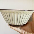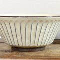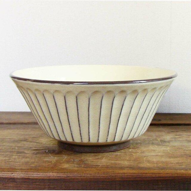 外側に「しのぎ」を施し器全体に化粧泥を掛けてから透明釉を掛けて焼成しています。