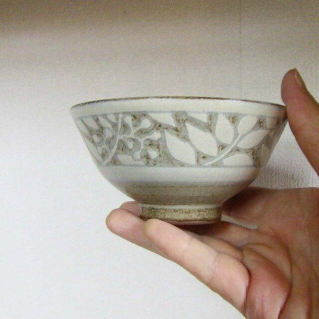 器全体に白い化粧泥を掛け、ナナカマドを描いてから余分な化粧泥は削り落として図柄だけを残しています。
