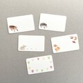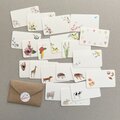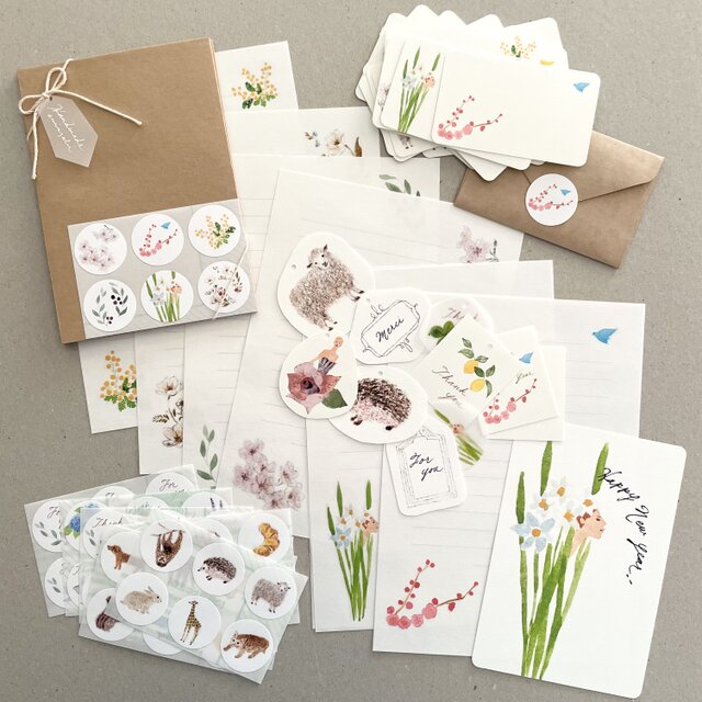 色鉛筆や透明水彩で描いた植物や動物のレターセット、メッセージカード、シール、タグをいろいろ詰め合わせた楽しい紙ものセットを作りました。