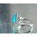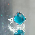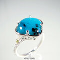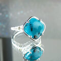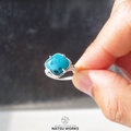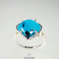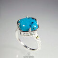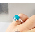 鮮やかなブルーのクリソコラカルセドニー / ジェムシリカを、18金のボールで飾った透かし模様の台座にセットしたリング。
