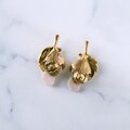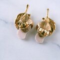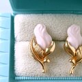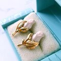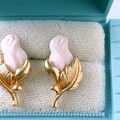1886年アメリカのニューヨークにて小さな香水会社を創業、1971年に本格的にコスチュームジュエリーの製作を開始したAvon(エイボン)の1994年に販売された“Genuine Porcelain Rose”のゴールドメタルのリーフに薔薇の蕾がデザインされたピンクのポーセリンがあしらわれたヴィンテージピアスです。