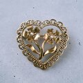 1886年アメリカのニューヨークにて小さな香水会社を創業、1971年に本格的にコスチュームジュエリーの製作を開始したAvon(エイボン)の1998年に販売された“ANTIQUED HEART PIN”の黒ずみ加工が施されたゴールドメタルのフェイクパールがあしらわれたフラワーをレースの付いたオープンハートで囲ったデザインのヴィンテージブローチです。