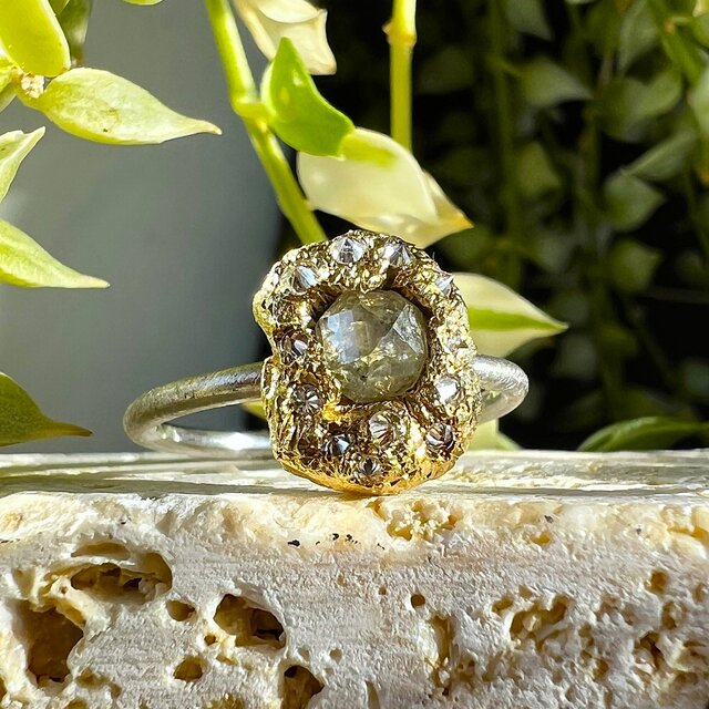 溶けた金属に直接宝石をセットする特殊な制作方法をとっており、