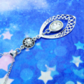 アラベスク調の透かしの入ったティアドロップのモチーフにガラスチャームを中心に吊り下げています