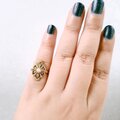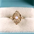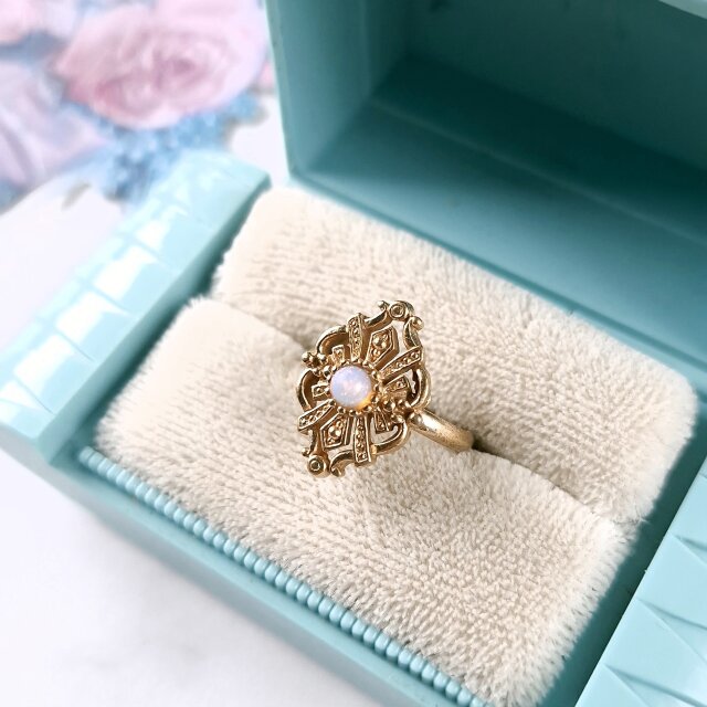 1886年アメリカのニューヨークにて小さな香水会社を創業、1971年に本格的にコスチュームジュエリーの製作を開始したAvon(エイボン)の1982年に販売された“RENAISSANCE”の中央にフェイクオパールガラスがあしらわれたヴィクトリアデザインのオープンワークのヴィンテージリングです。