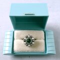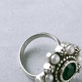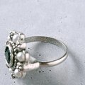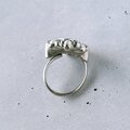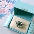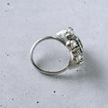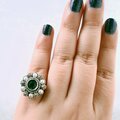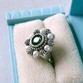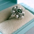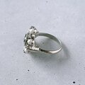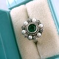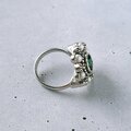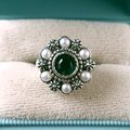 1949年にニューヨークで創業したSarah Coventry(サラコベントリー)の1974年に販売された“Viva”のシルバーのフラワー装飾メタルの中央にグリーンのラインストーン、周りに淡くブルー掛かったグレーのフェイクパールがあしらわれたヴィンテージリングです。