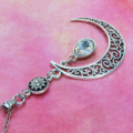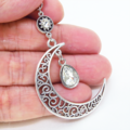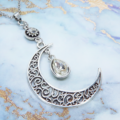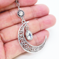 アンティークシルバー アラベスク調の透かし模様の入った三日月にラインストーンのムーンネックレス 長さ調整可