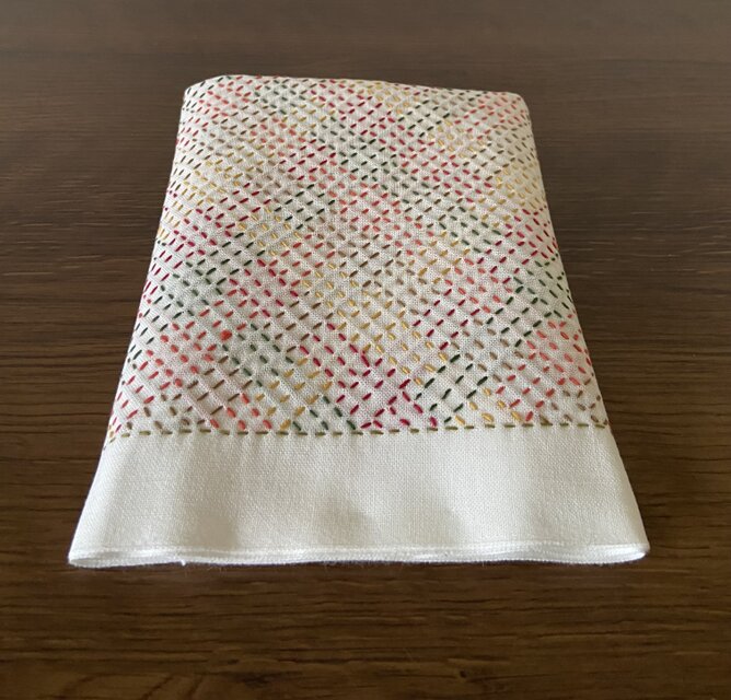 届きました!あみちゃんさんのふきんは、裏の模様もとてもきれいなのでなるべく両方みえる使いかたをしています。 さて、この横長、どう使おうかな、と考えるのが又楽しいです。ありがとうございました。