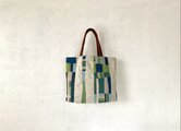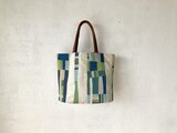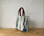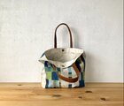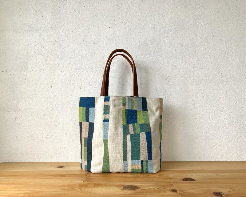3色の綿糸でのステッチが とっても丁寧に 刺してあり 美しいデザインに! ヌメ革の持ち手が 個性的でインパクトあり 経年変化が 楽しみ。 コンパクトに くったりなるので 使い勝手が良い。