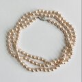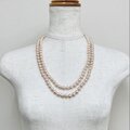 こちらはガラス素材の原玉に、オリジナルパール塗料にて何層にも渡り重ね塗りを施した日本製ガラスパールを使用しております。パール間には1つづつ丁寧に結び目を加えたオールノット仕様にしました。パールサイズは直径約8mm、長さは服の上からでもゆったり着けられる全長約120cmとなっております。1連でかなり長いロングネックレス、くるっと巻いて2連ネックレスにとアレンジも可。パールカラーは、きめ細かい質感と優しい艶感が特徴で落ち着いた色合いのペールピンク。2026年の流行色ハートフェルトピンクをイメージして作製しました。