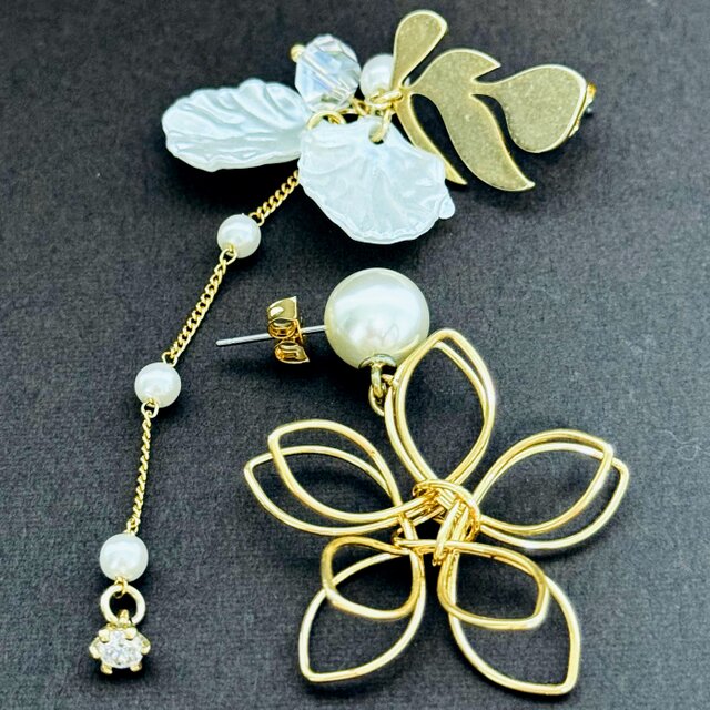 左右で異なるデザインが耳元で華やかに揺れ、あなたの魅力を引き立てるアイテムです♪