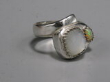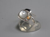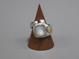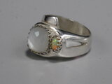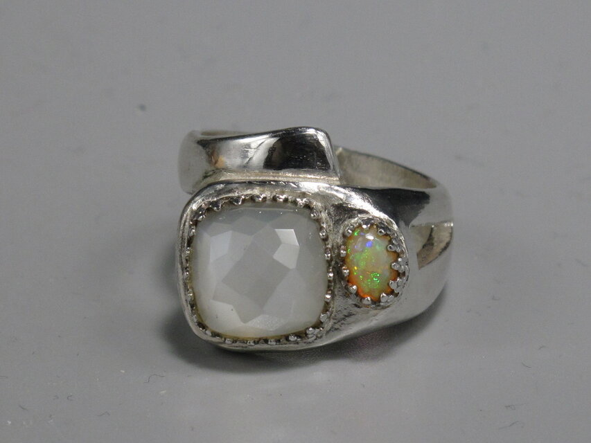 ムーンストーンの表面には細かいカットが施され、オパールには複数の遊色が見られます。