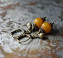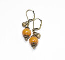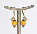 ツートン琥珀色アフリカンアンバーと民族鈴のピアス(丸)