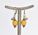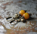 ツートン琥珀色アフリカンアンバーと民族鈴を繋いだピアスです。