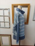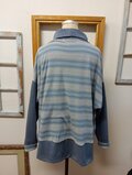 ゆったり楽ちんタートルネックのチュニックトップス。デザインボーダー柄のストレッチカットソーで薄手で柔らかな手触りのチクチクしにくいコットンポリエステル素材です。ニットみたいなカットソーです。ボーダー柄と無地のバイカラーっぽくなっていますが、薄手なので前身頃、後ろ身頃2枚合わせになっていて腕は1枚です。
