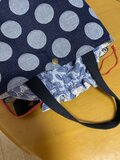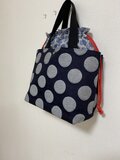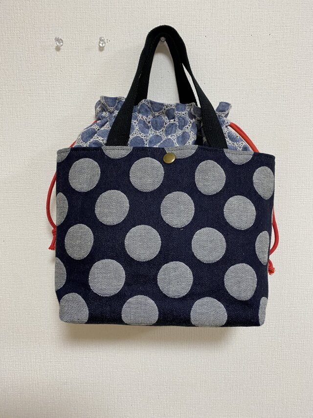 ジャガードデニムのトートバッグにダンガリーサークルレースの巾着を付けてあおり巾着バッグに仕立てました。
